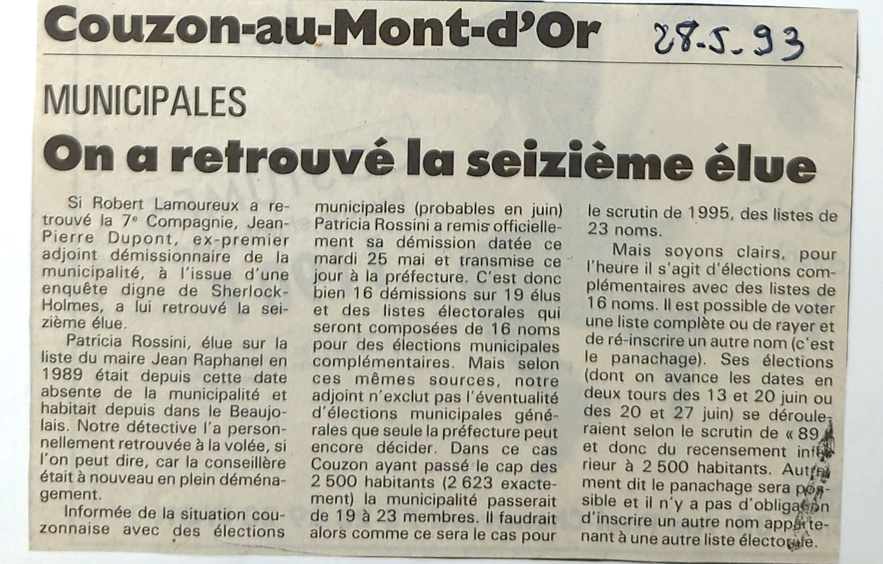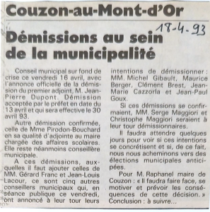 Dans son édition du 18 avril 1993, LE PROGRES titre « Démissions au sein de la municipalité ».