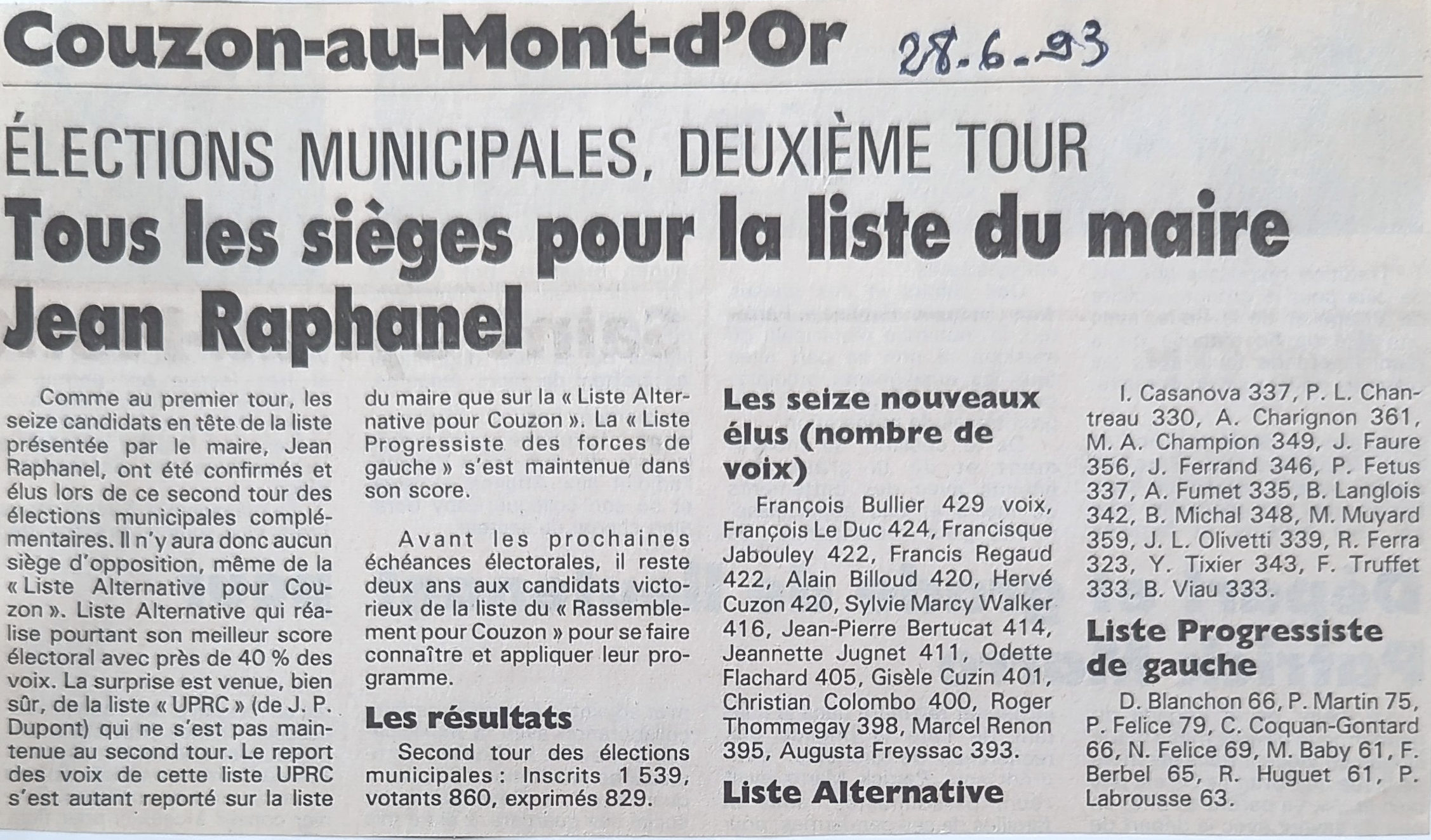 Comme le titre LE PROGRES dans son édition du 28 juin 1993 « Tous les sièges pour la liste du maire Jean RAPHANEL ».